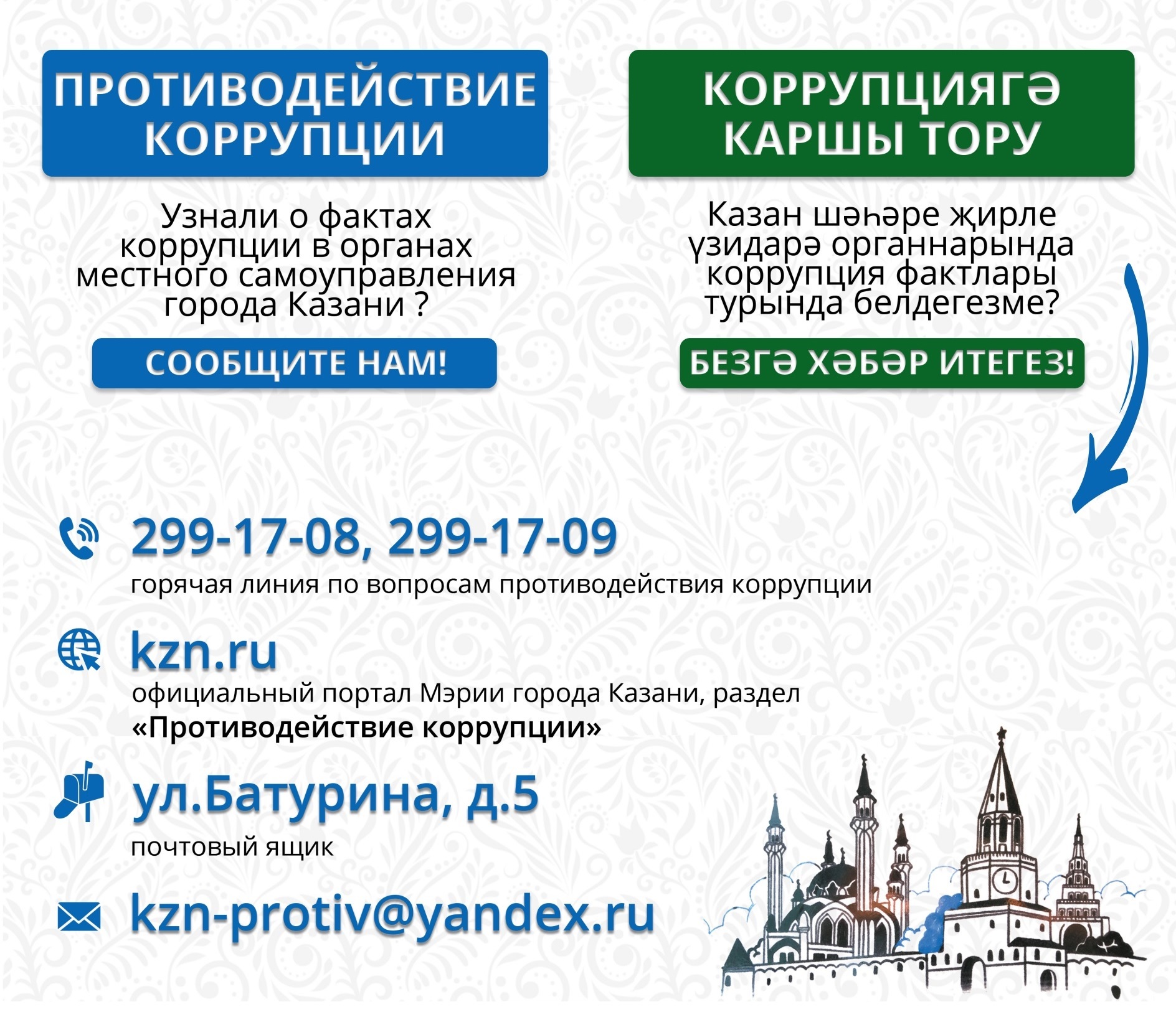 Данный раздел посвящен антикоррупционной деятельности, проводимой в муниципальном образовании города Казани. В разделе Вы можете найти подробную информацию о принимаемых мерах и проводимых мероприятиях по противодействию коррупции, телефоны горячих линий, информацию о должностных лицах, ответственных за работу по профилактике коррупционных и иных правонарушений, сведения о доходах, расходах, об имуществе и обязательствах имущественного характера и др.